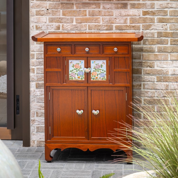 자연 그대로의 나뭇결이 살아있는 모란꽃 책장은 부귀영화를 상징하는 의미의 모란꽃 문양이 고혹적인 칠보와 조화를 이루어 우아하면서도 고급스러운 분위기를 자아내는 작품입니다.