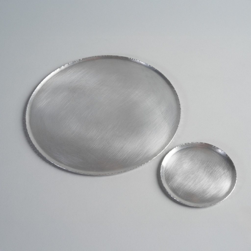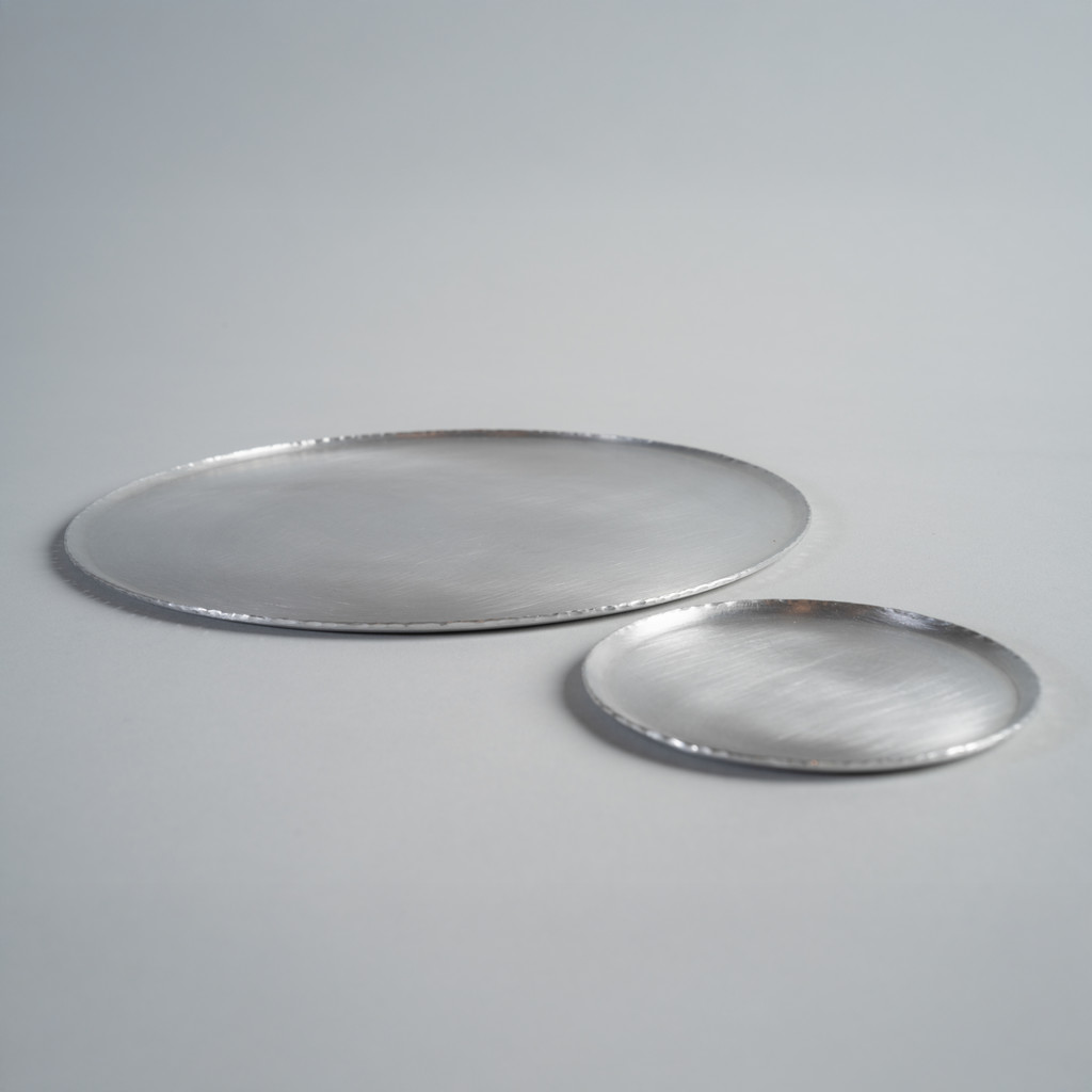 ⊙ 순 알루미늄판을 직접 망치로 두드려 제작한 작품입니다. 해가 비스듬히 기울때 접시 끝 모서리 부분의 망치자국이 반짝거리는데 과하지 않은 담백한 우아함이 매력적입니다.