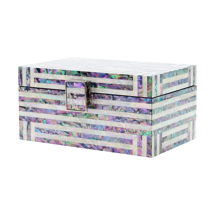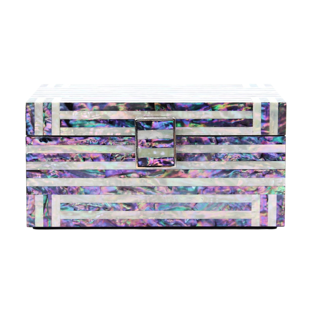 한국의 전통 창호, 격자문으로부터 영감을 받아 디자인한 함입니다. 가로 세로의 직선, 같은 간격의 문살, 직각으로 교차해 나가는 패턴, 그리고 하늘을 닮은 푸른 쪽빛과 자개의 끊임없는 반짝임이 매력적인 채율의 모던라인 대표 작품입니다.